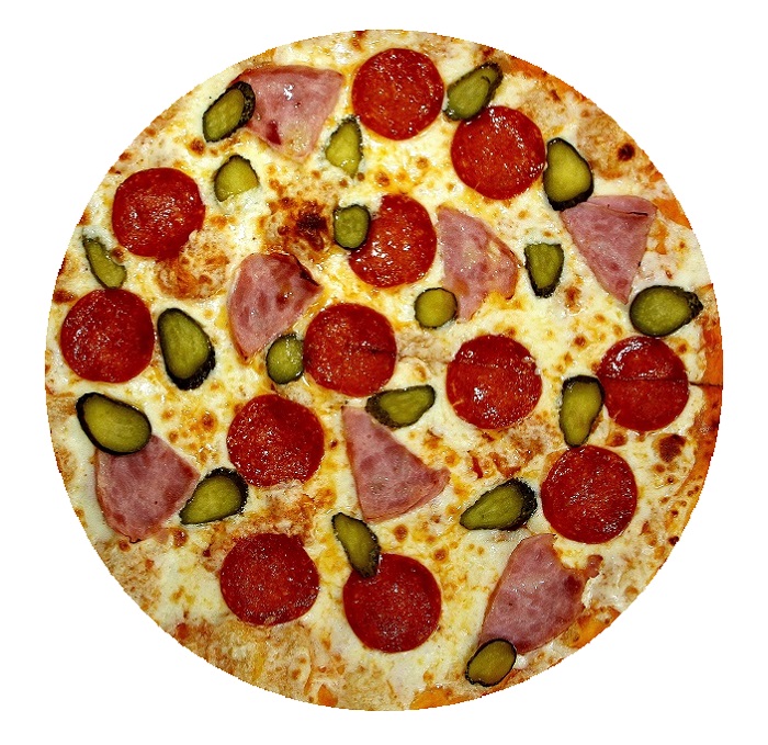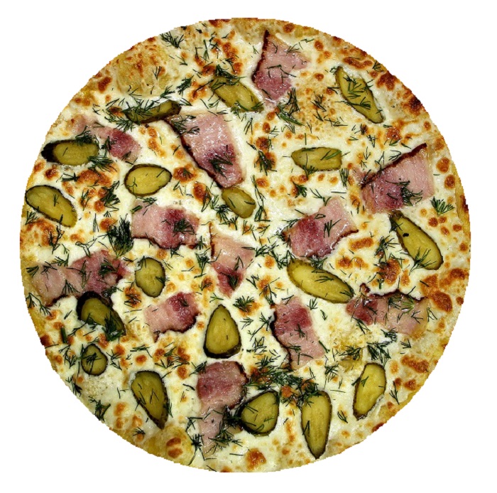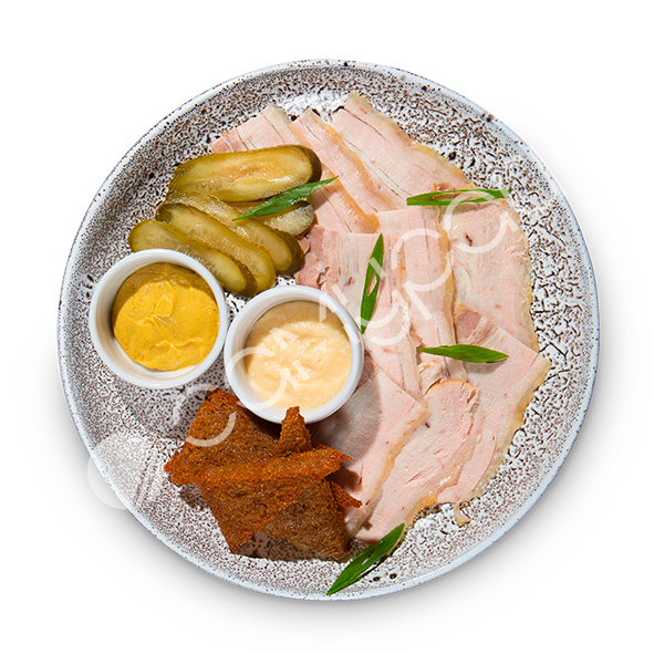 Копченая грудинка, гренки, зеленый лук, соленый огурец, хрен, горчица.