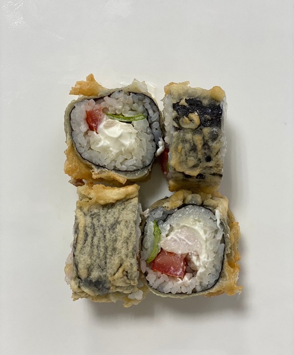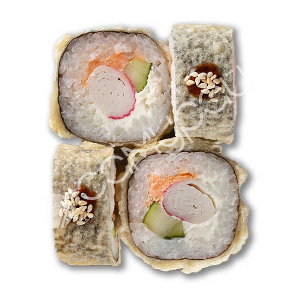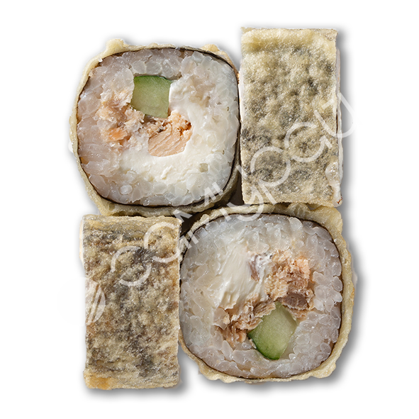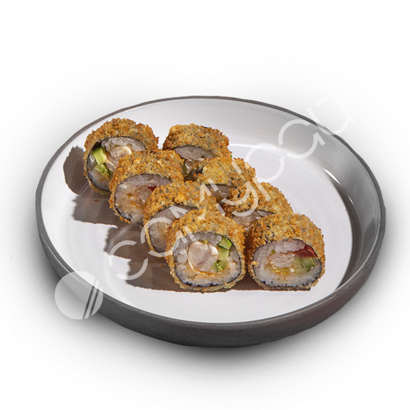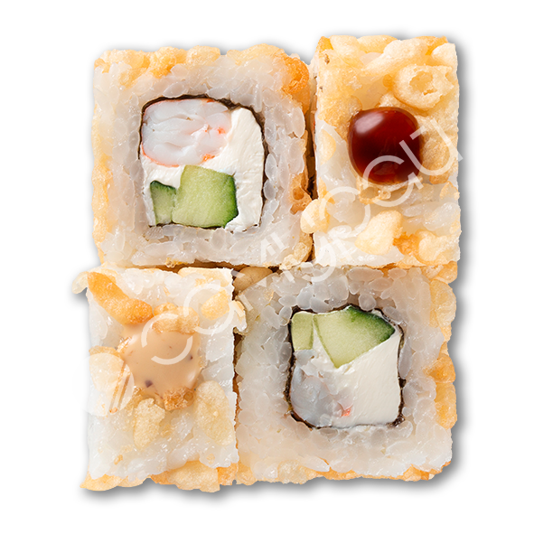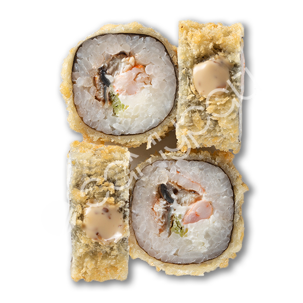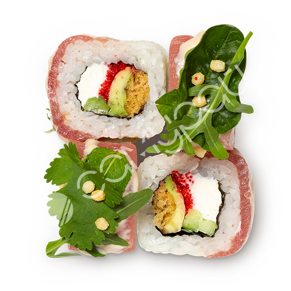 Тунец, сливочный сыр, тобико, огурец, хрустящая панировка, соус сливочный унаги, рисовые шарики, микс зелени