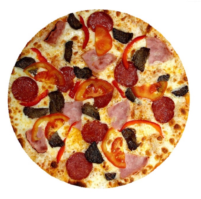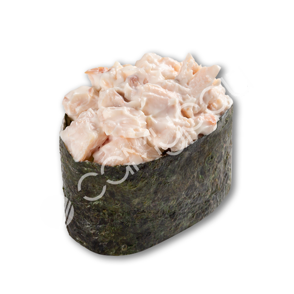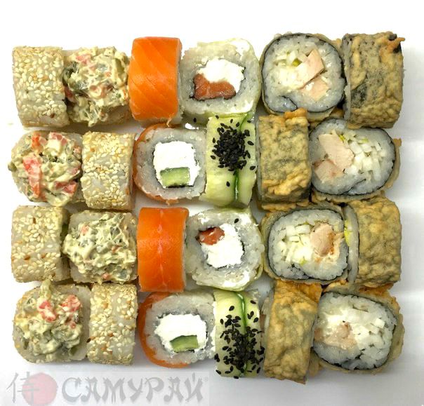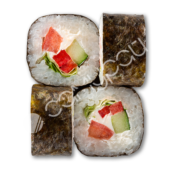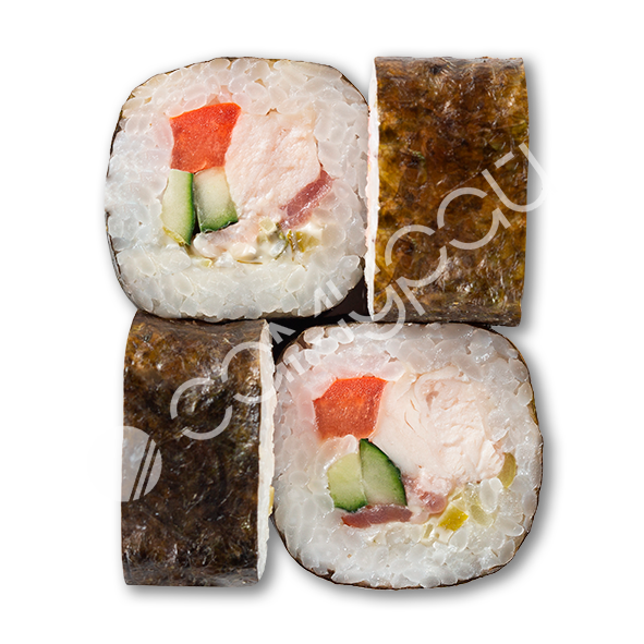 Нори, креветки тигровые, курица копченая, тунец, авокадо, сыр сливочный.