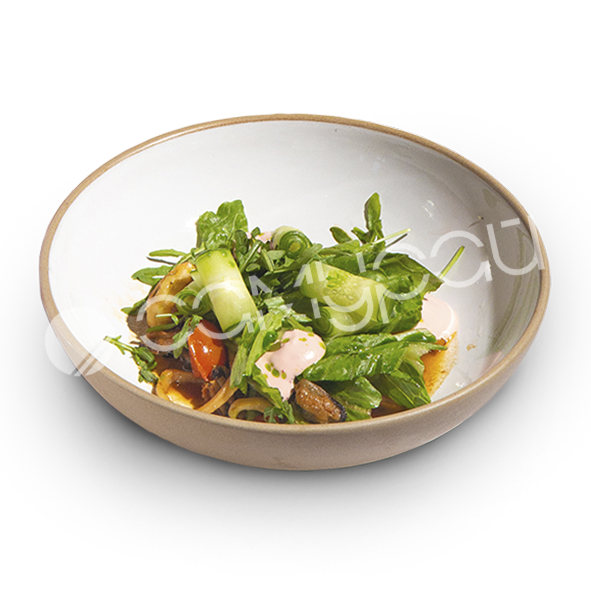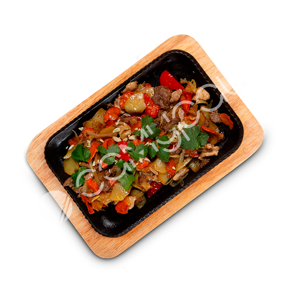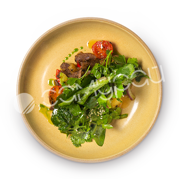 Говяжья и свиная вырезка, куриное филе, овощи, гремолата из чеснока, зелень