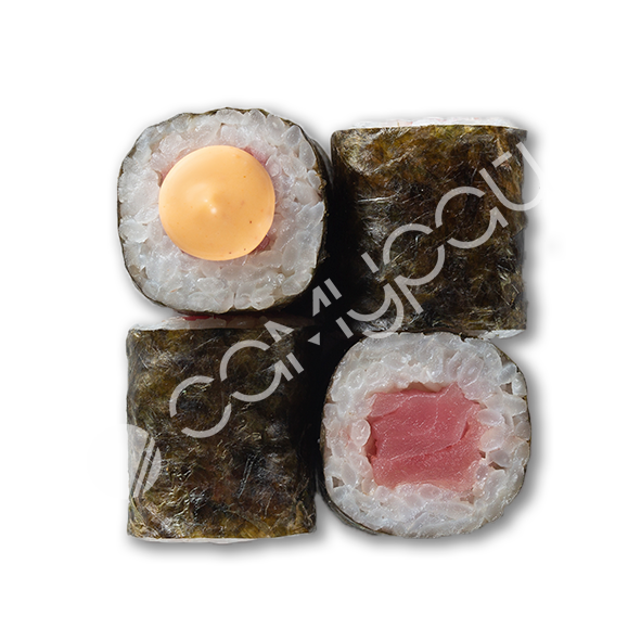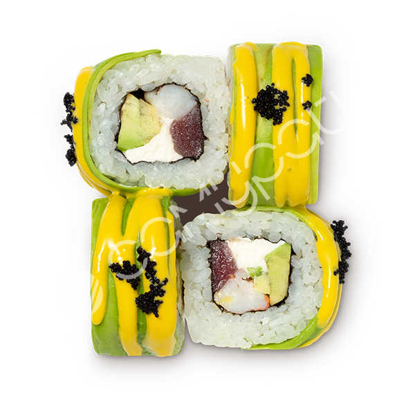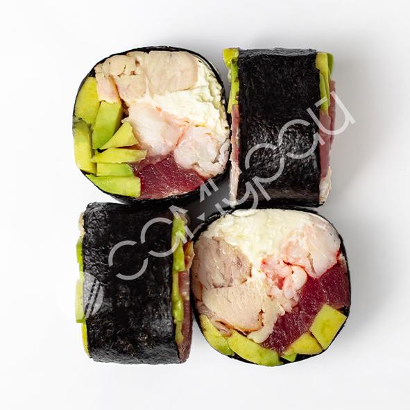 Ролл с тунцом, креветкой, авакадо и соусом манго майо