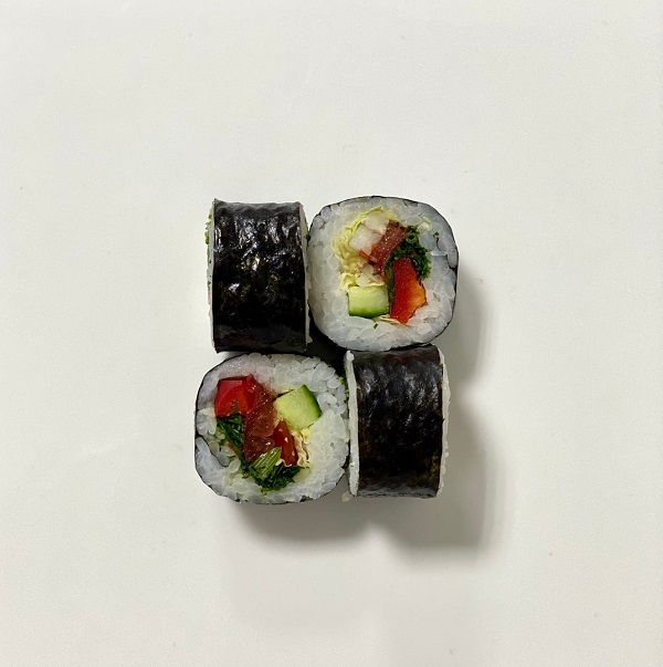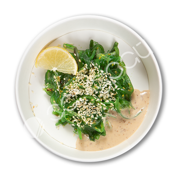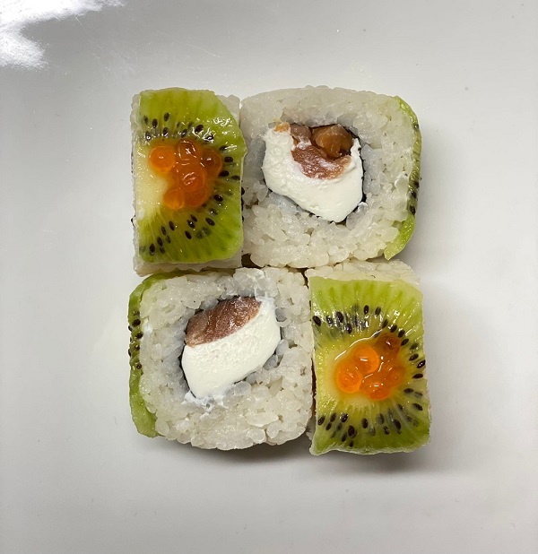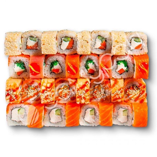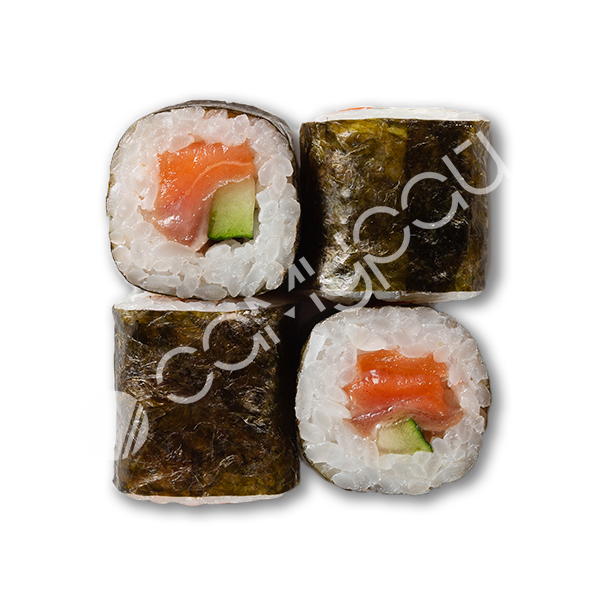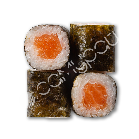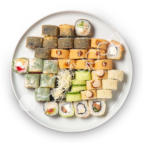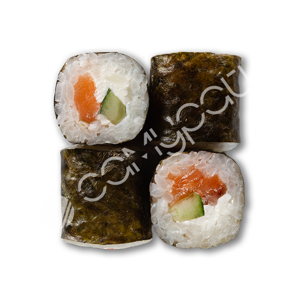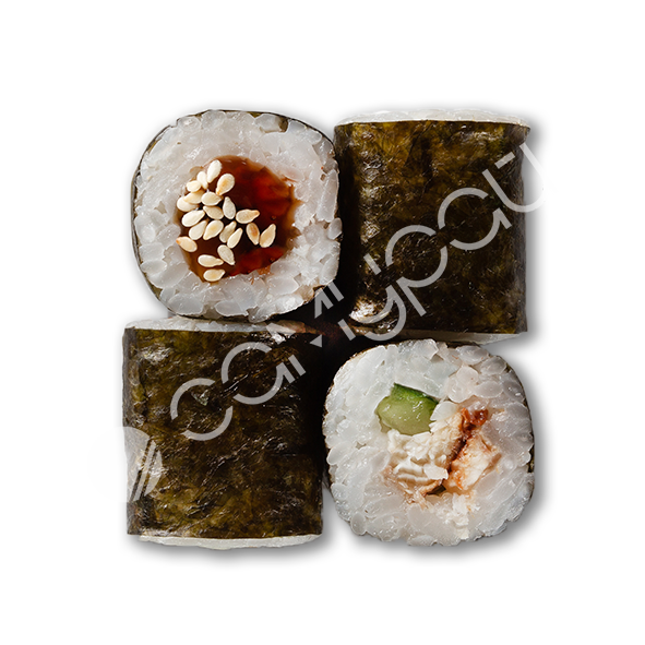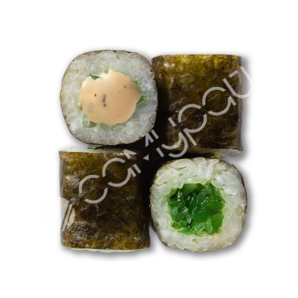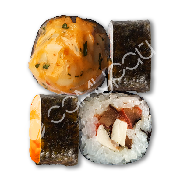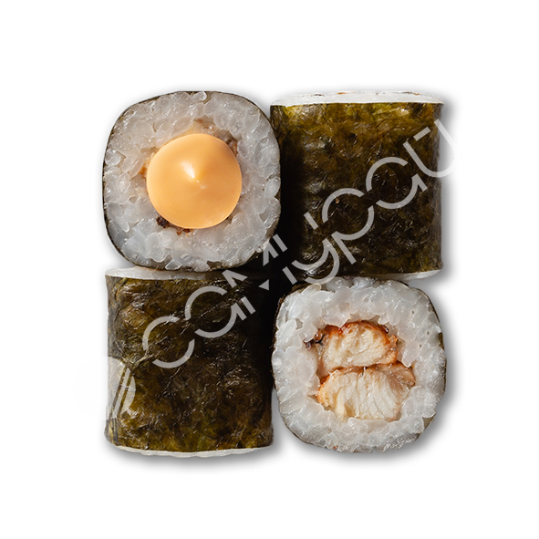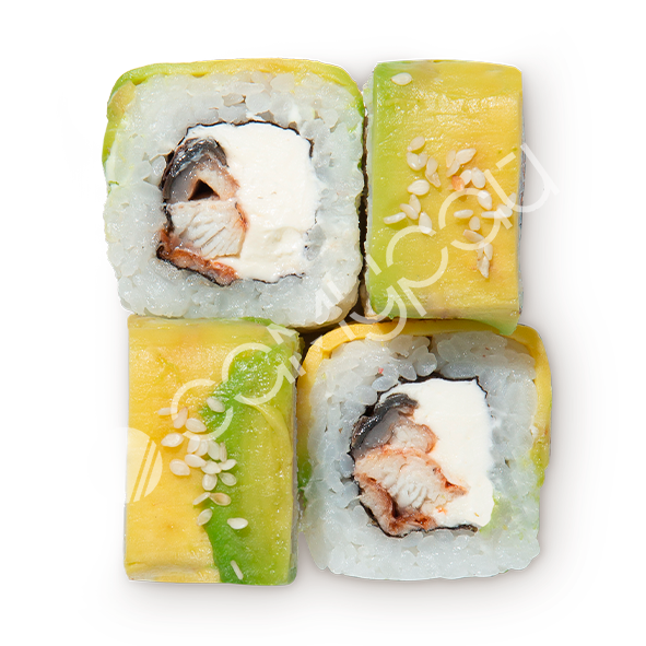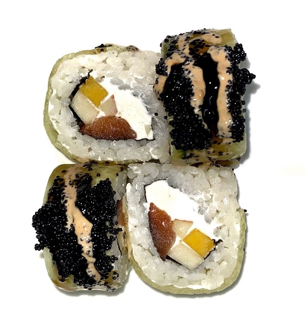 Рис, фирменный соус. огурцы свежие, лосось, авокадо, эдамаме, манго консервированное, фирменная заправка, тобико, кинза,лук зеленый, кунжут, нори
