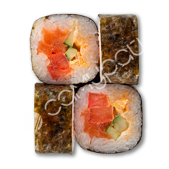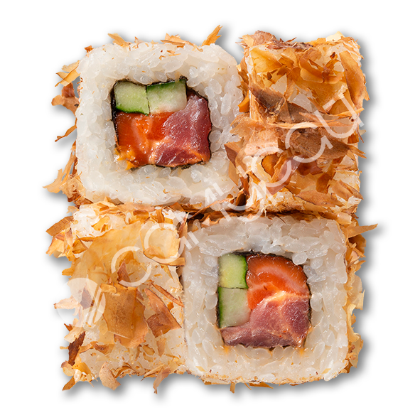 Тунец,лосось,огурец,соус спайс,тунцовая стружка