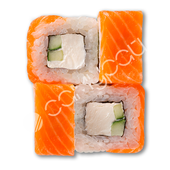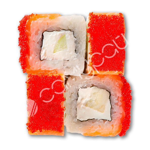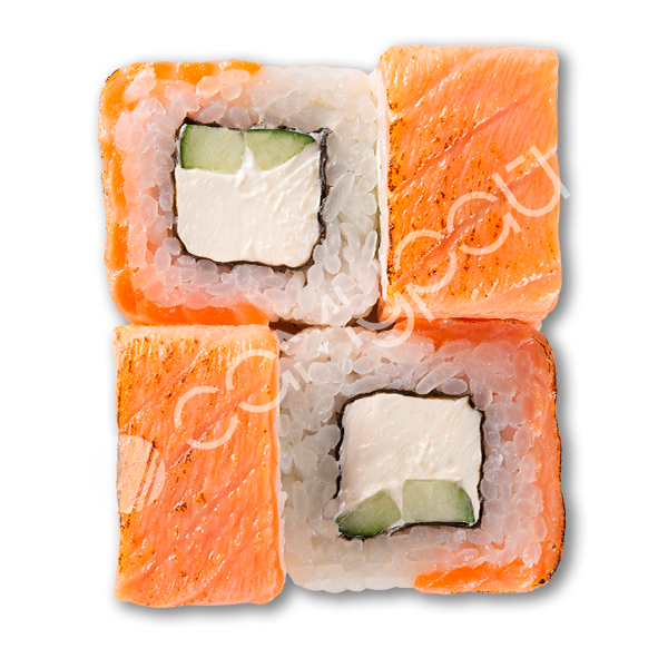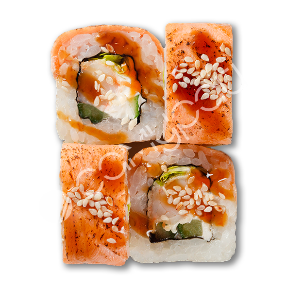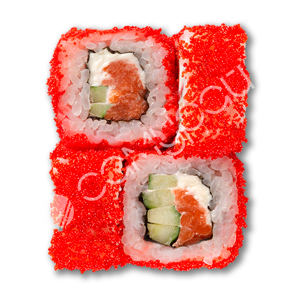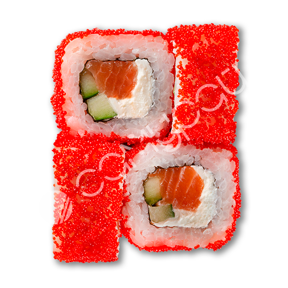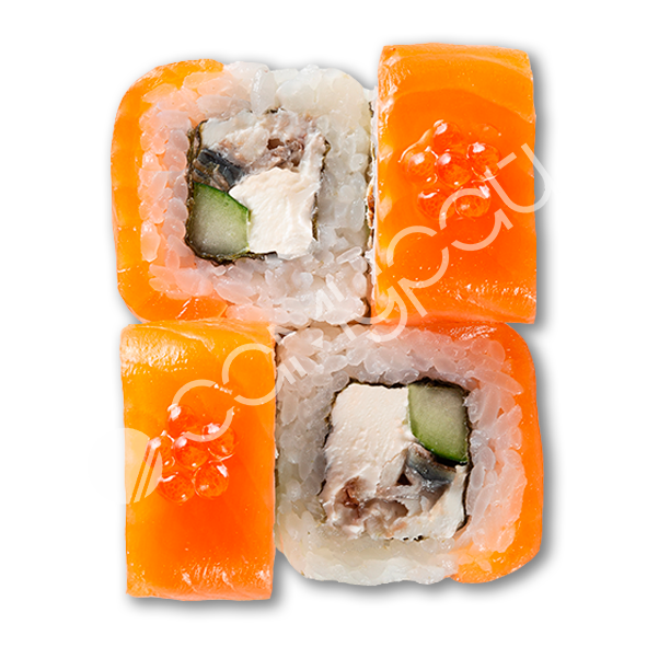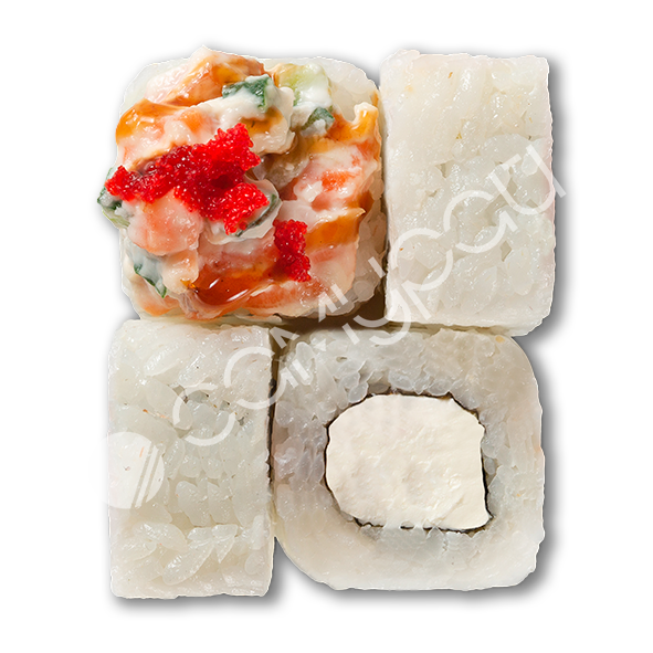 Лосось, сливочный сыр, огурец, фирменный соус, тобико, соус унаги, рис.