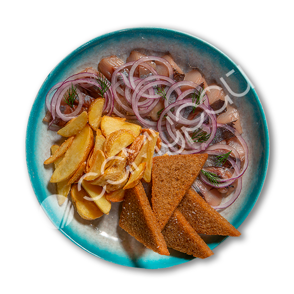 Слабосоленая сельдь с картофелем по деревенски и гренками