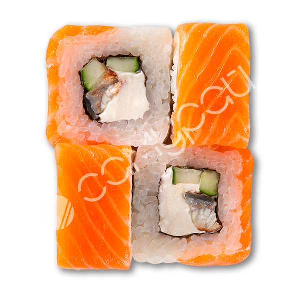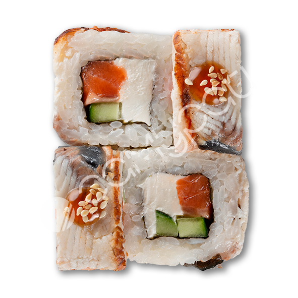 Копченый угорь,лосось,огурец, сливочный сыр, соус унаги, кунжут