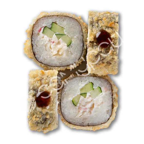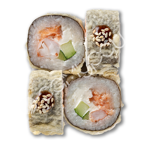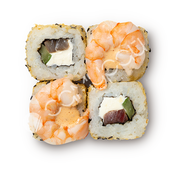 Тигровая креветка, тунец, сыр сливочный, огурец, хрустящая панировка, кунжут, соус спайси-юдзу
