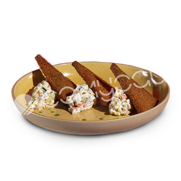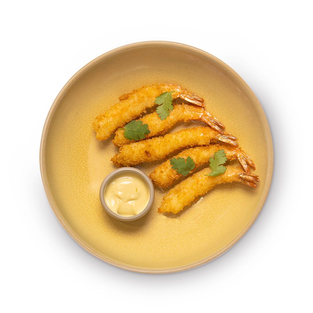Тигровые креветки в панировке, соус манго, майонез, кинза.