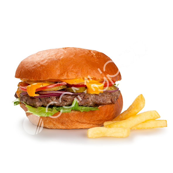 Булочка бриош, говяжья котлета, вишневый соус, салат айсберг, помидор, сыр чеддер, горчица, майонез