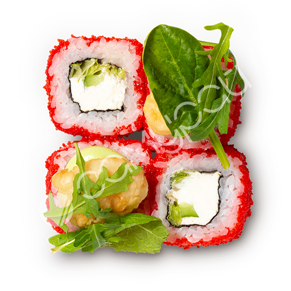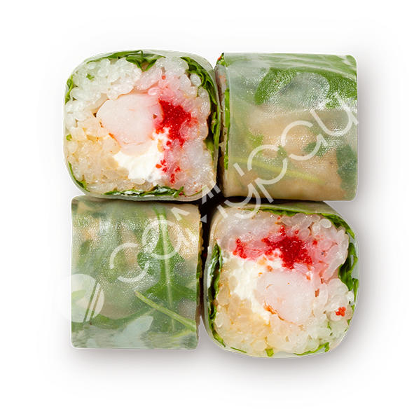 Тигровая креветка, рисовая бумага, сыр сливочный, тобико, рукола, соус спайси-юдзу и соус унаги-шисо.