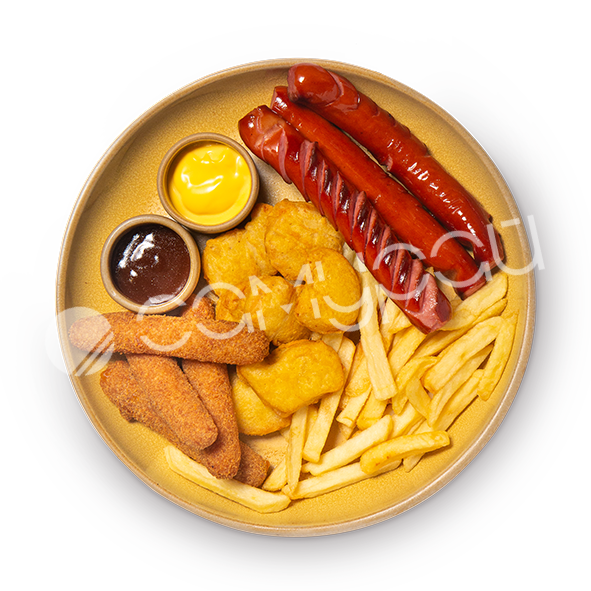 Сырные палочки, наггетсы куриные, колбаски, картофель фри, соус сырный, соус BBQ.