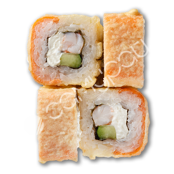 Тигровая креветка в кляре, тобико, сыр сливочный, огурец, лист салата, маринад сладкий чили, соус васаби-майо, микс зелени.