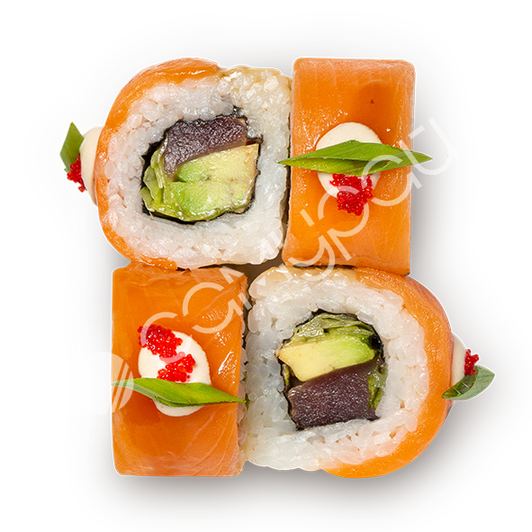 Тунец, лосось, авокадо, лист салата, тобико, соус нисуаз, соус спайси-юдзу, соус унаги-юдзу, зелёный лук.