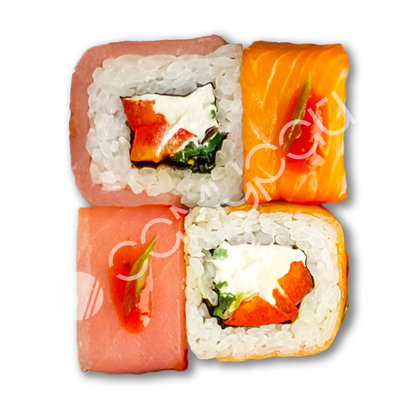 Тунец, тигровая креветка, авокадо, сыр сливочный, тобико, соус манго-майо.