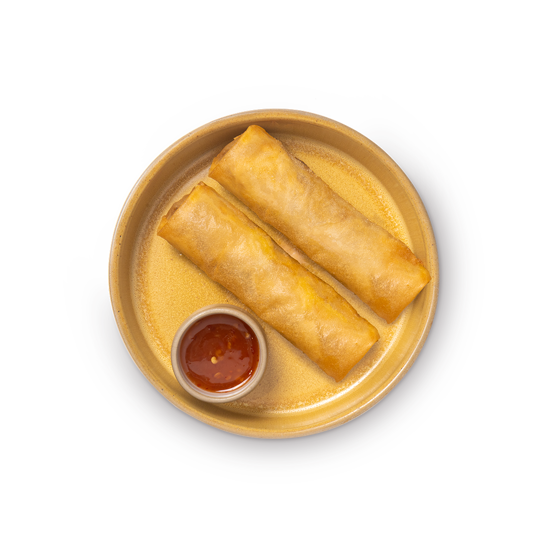 Спринг-тесто, утка по пекински, чеснок, имбирь, морковь, грибы шиитаке, моцарелла, зеленый лук, кинза, соусы кисло-сладкий, устричный и сладкий чили